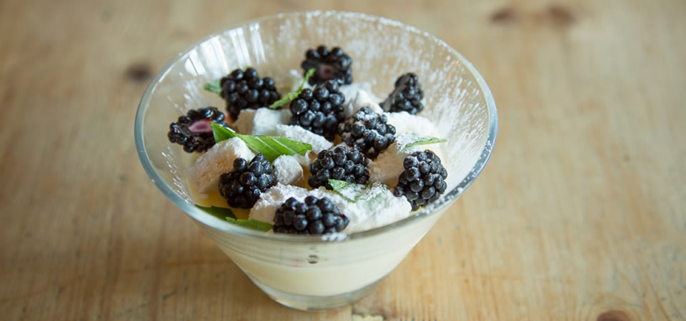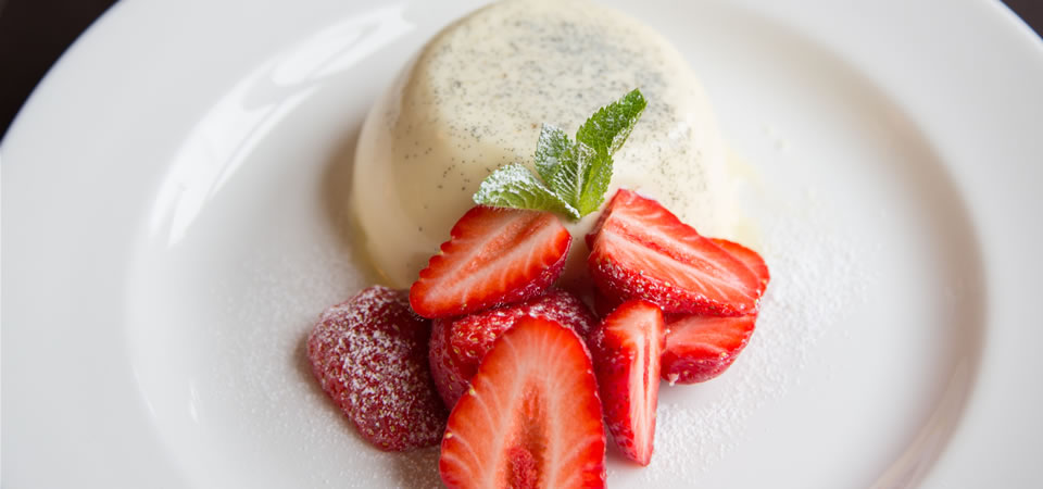 Tonka Bean and Buttermilk Panna Cotta, poached Rhubard with lemon thyme and olive shortbread £7.00